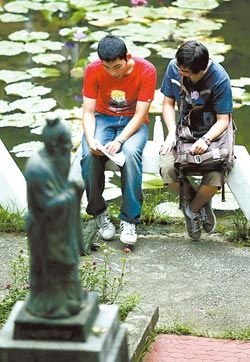2009年台湾指考第2天考试,2位考生在孔子像旁做最后冲刺。图片来源:台湾《中国时报》